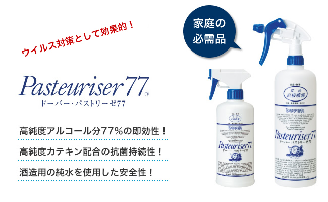 パストリーゼ77は、アルコール分が77%もあるので、とても強力な除菌力を持っています。酒造会社ならではの醸造用アルコールでできています。それに、緑茶から抽出した高純度のカテキンを配合しているので、抗菌力が長期間持続できます。